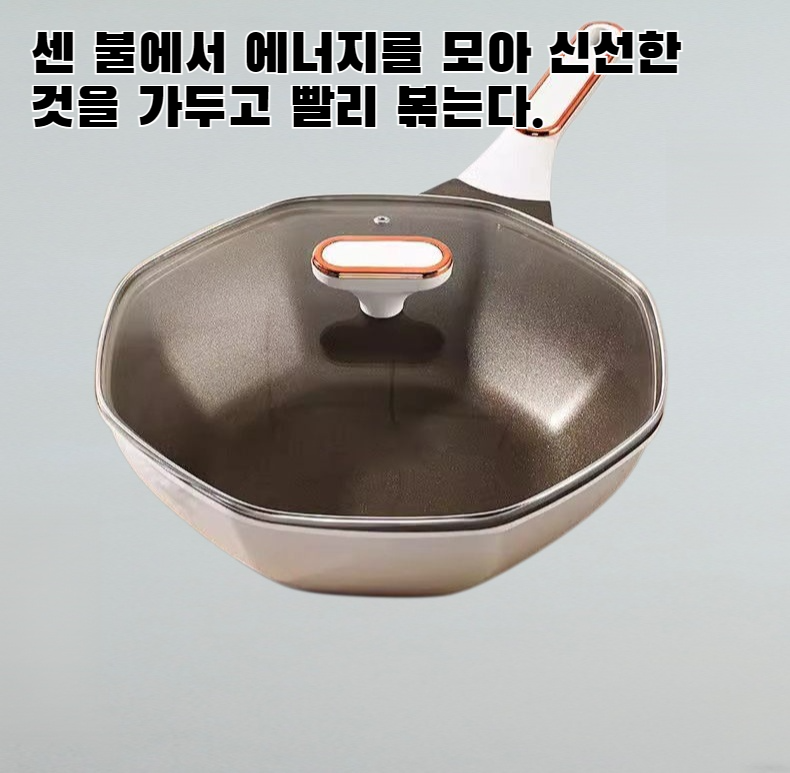 가정용 볶음 냄비, 넓은 바닥과 내열 소재로 균일한 열전도, 손쉬운 세척, 다양한 요리 활용 가능, 인덕션 포함 모든 열원 호환